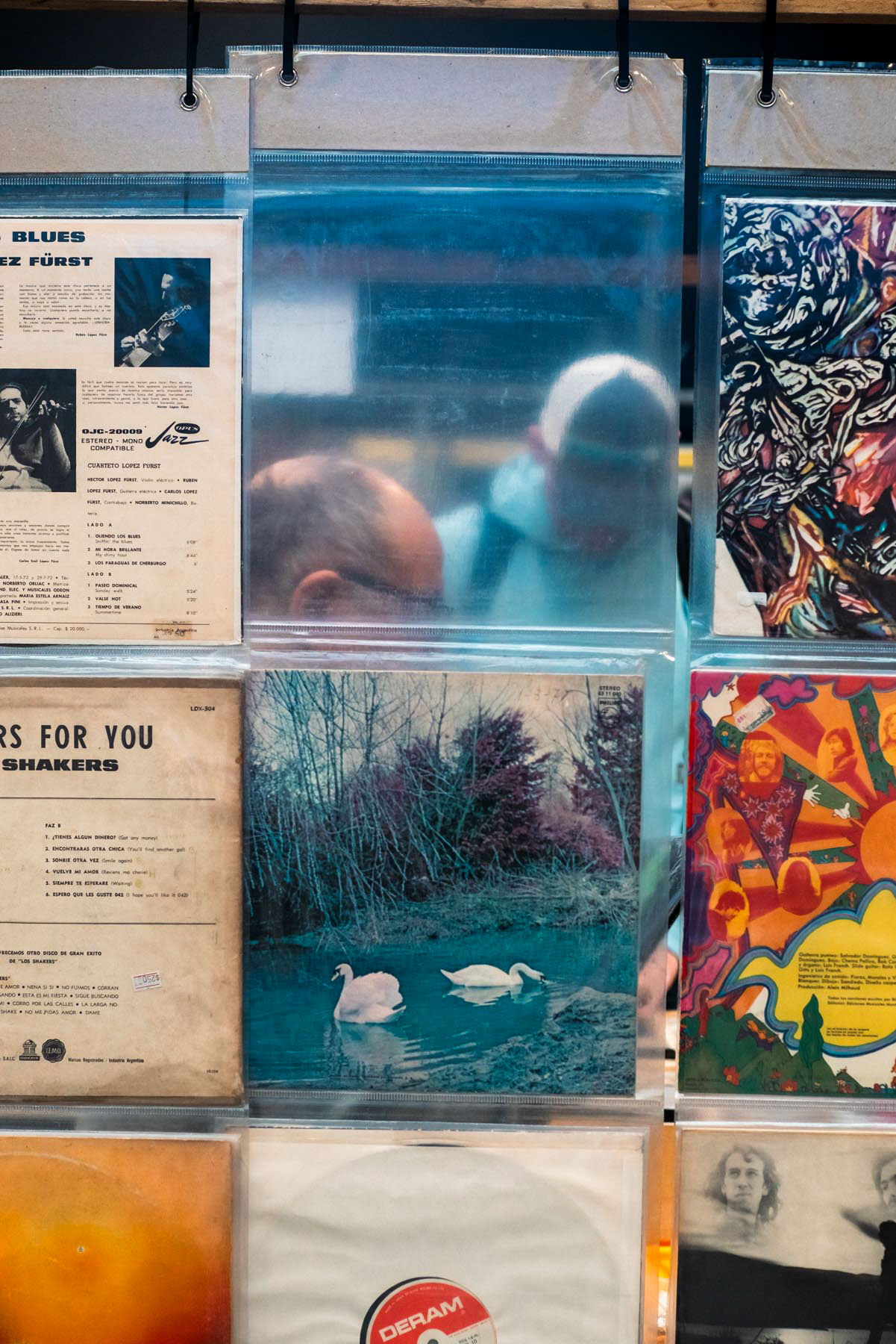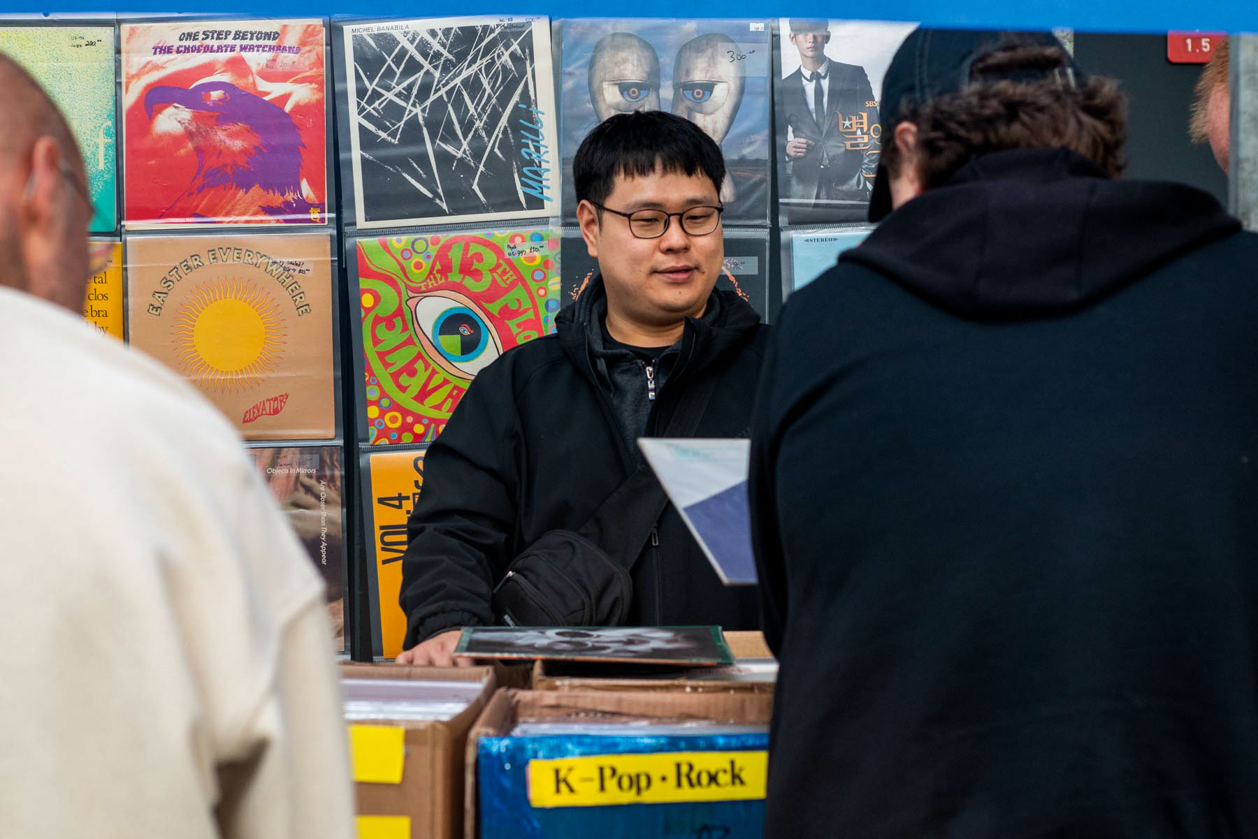 What struck me most were the plastic hangers—vertical displays of records forming curtain-like backdrops at nearly every booth. Layered, colorful, and full of character, they turned the fair into a visually rich landscape.